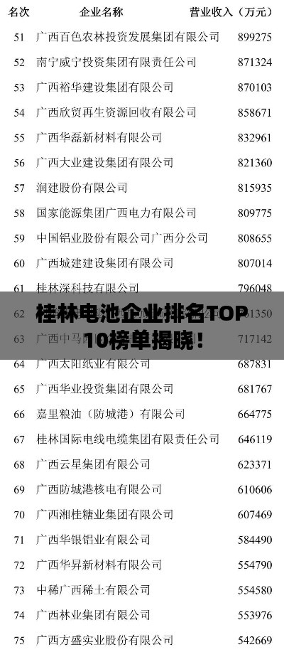 桂林作为中国电池产业的重要基地之一,拥有众多的电池生产企业,这些企业在研发、生产、销售等方面均取得了显著的成绩,为中国的电池产业发展做出了重要贡献,本文将介绍桂林电池企业排名前十名,以了解桂林电池产业的发展状况。