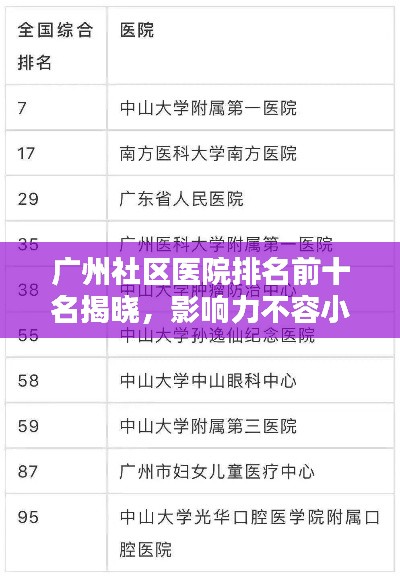 在广州这座繁华都市中,社区医院扮演着日益重要的角色,它们不仅为居民提供基础医疗服务,还在健康管理和疾病预防方面发挥着关键作用,本文将为您介绍广州社区医院排名前十名,这些医院在医疗质量、服务态度和社区健康促进方面均表现出色。